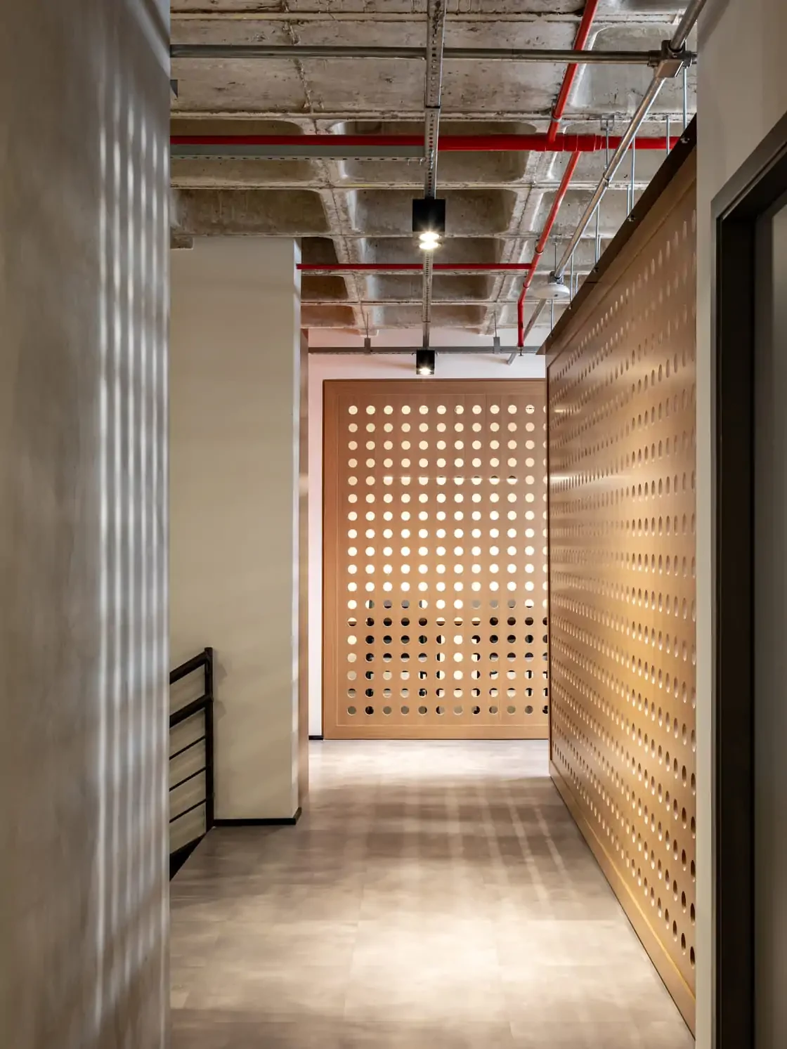 Seguindo a linha de não usar divisórias entre os departamentos, optamos por divisórias de madeira perfurada para alguns departamentos que necessitam de maior privacidade.