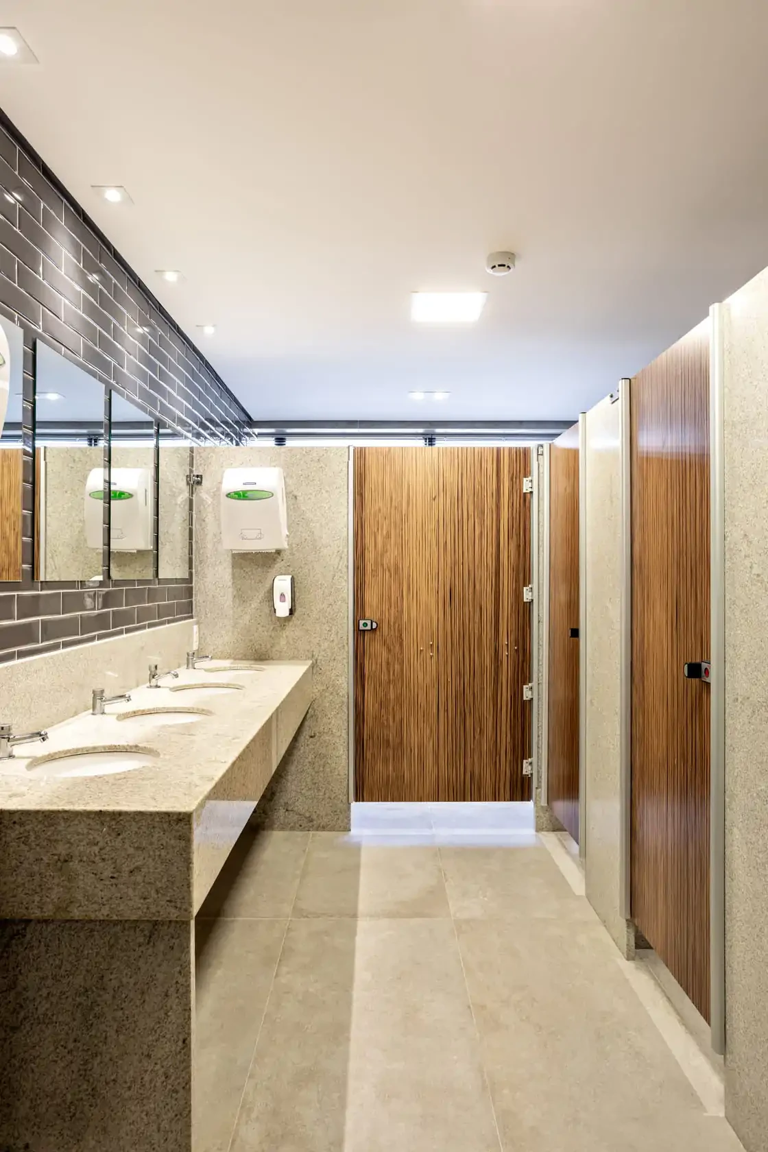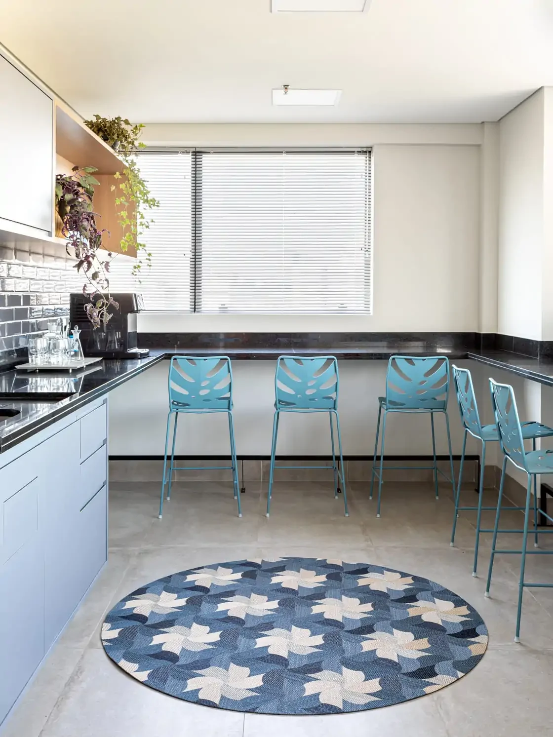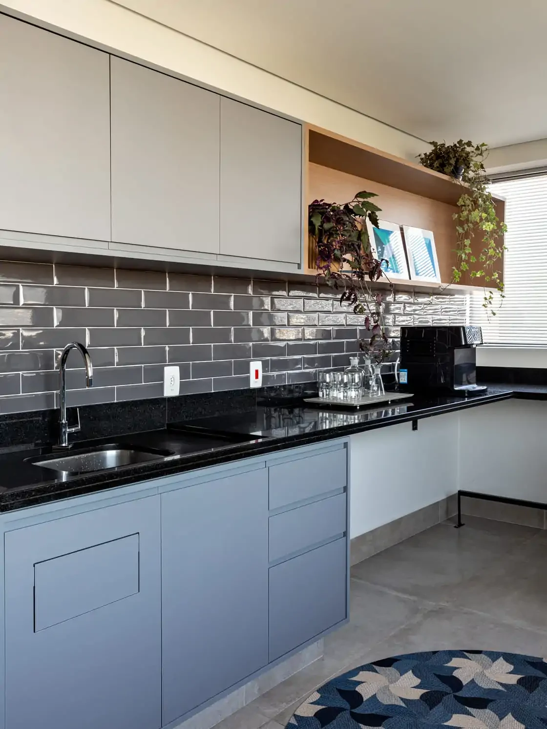 Cozinha e banheiros também seguem o estilo industrial da empresa.
