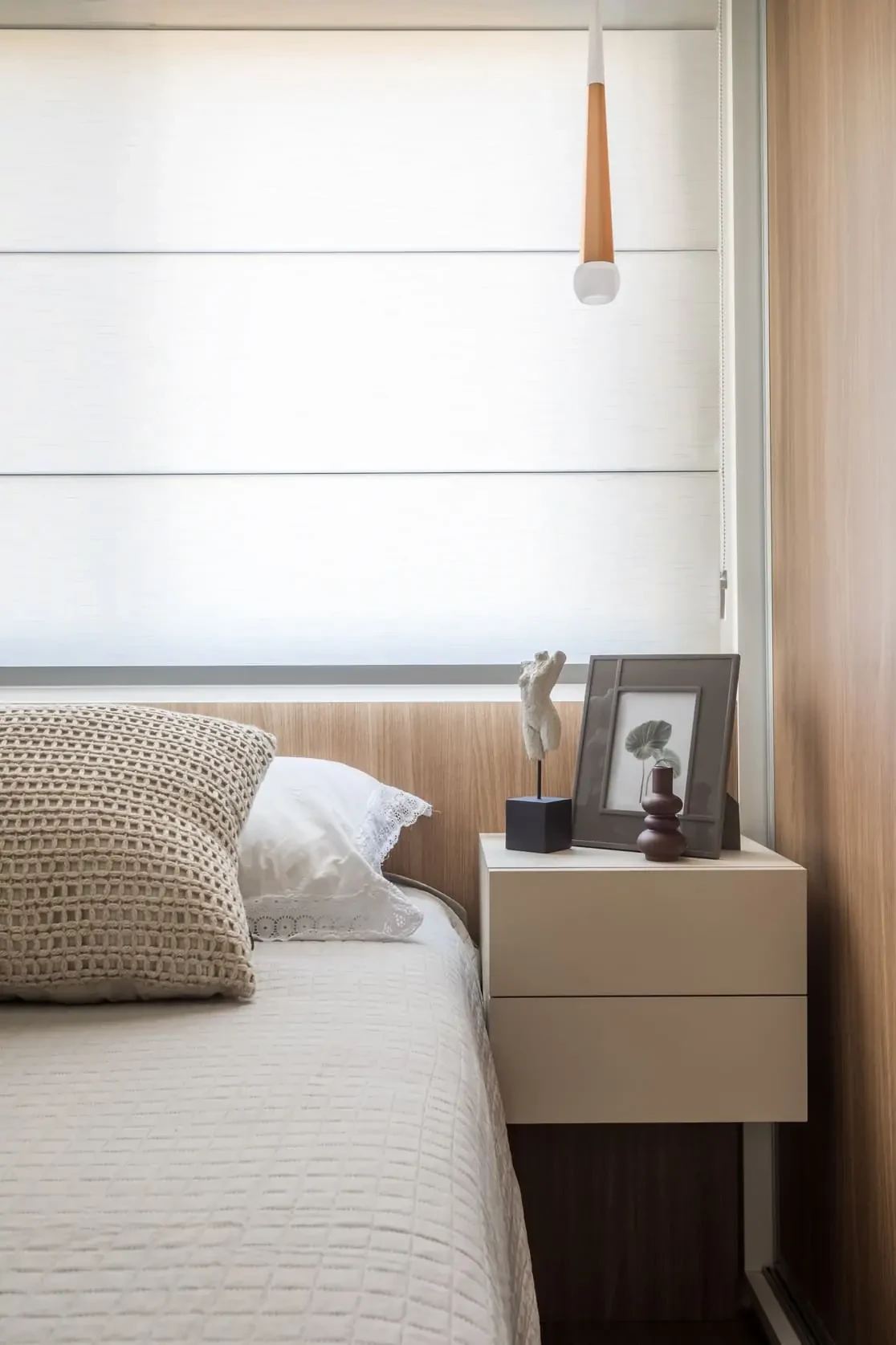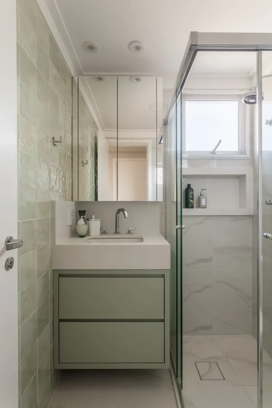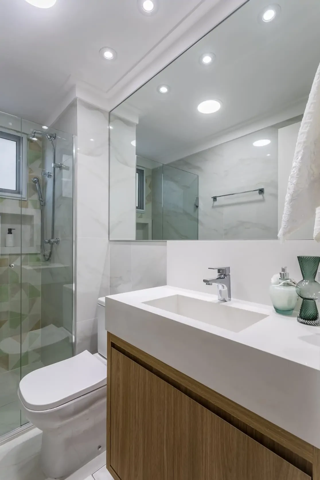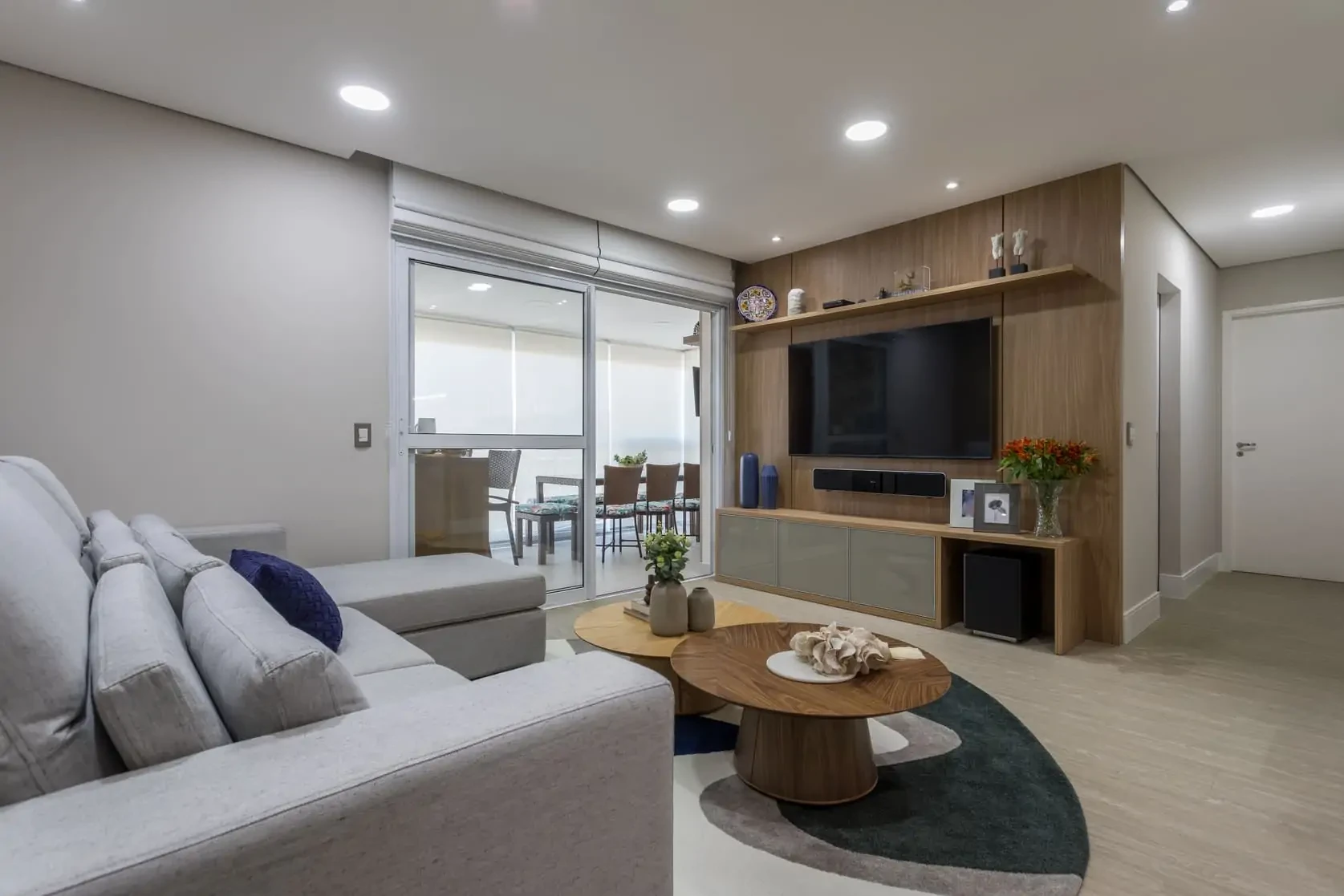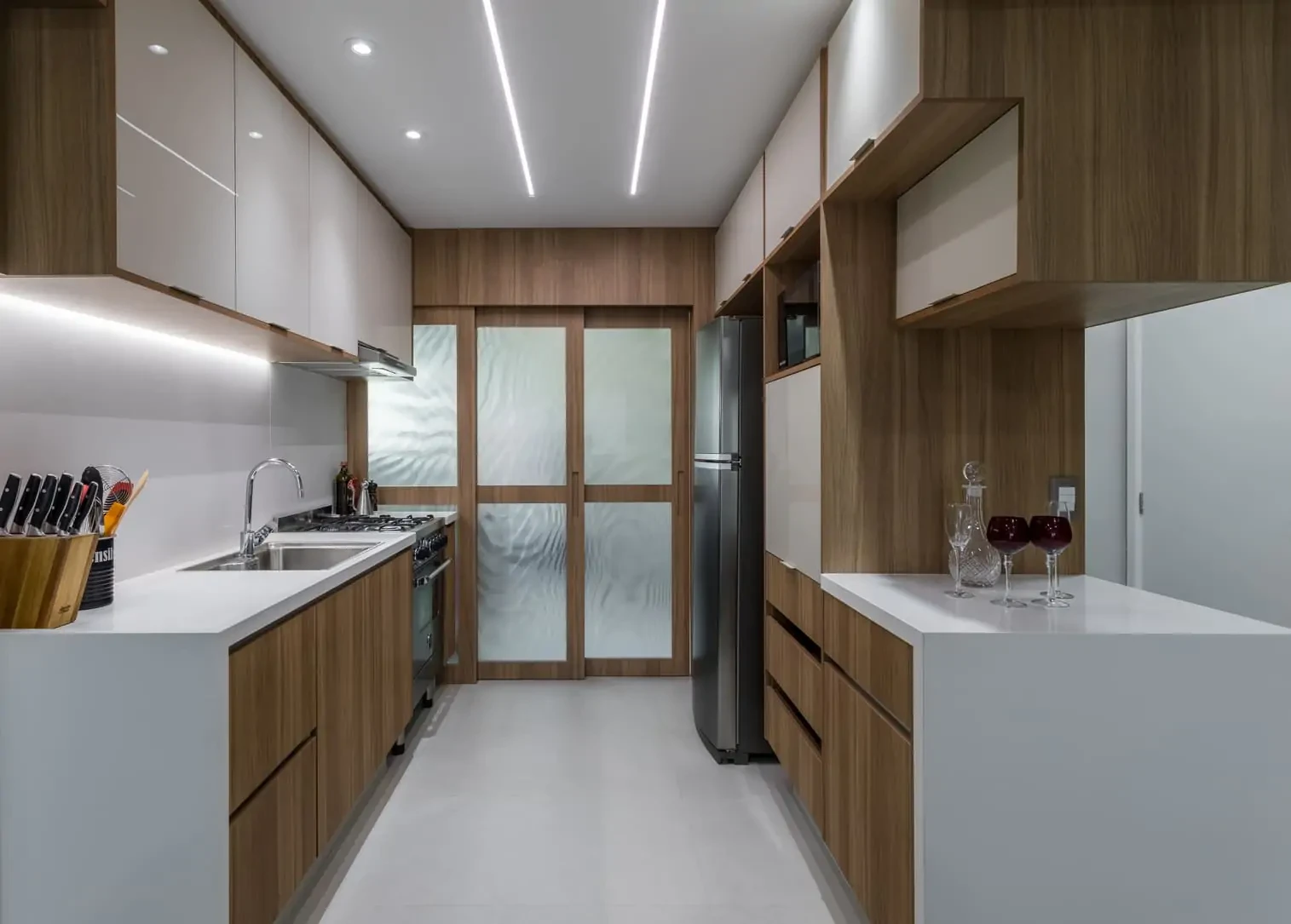 Neste projeto de reforma de apartamento e design de interiores, abrimos a cozinha para a sala e usamos grandes portas de correr de vidro para ocultar a área de serviços e ao mesmo tempo deixar entrar mais luz. Adotamos cores e acabamentos claros e neutros para ampliar a sensação dos espaços.