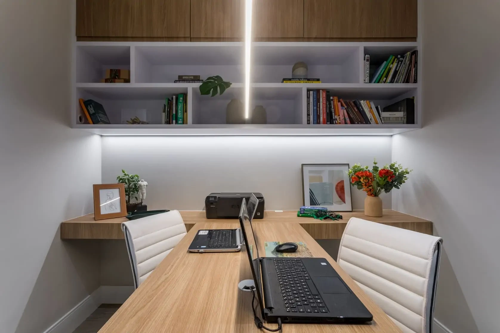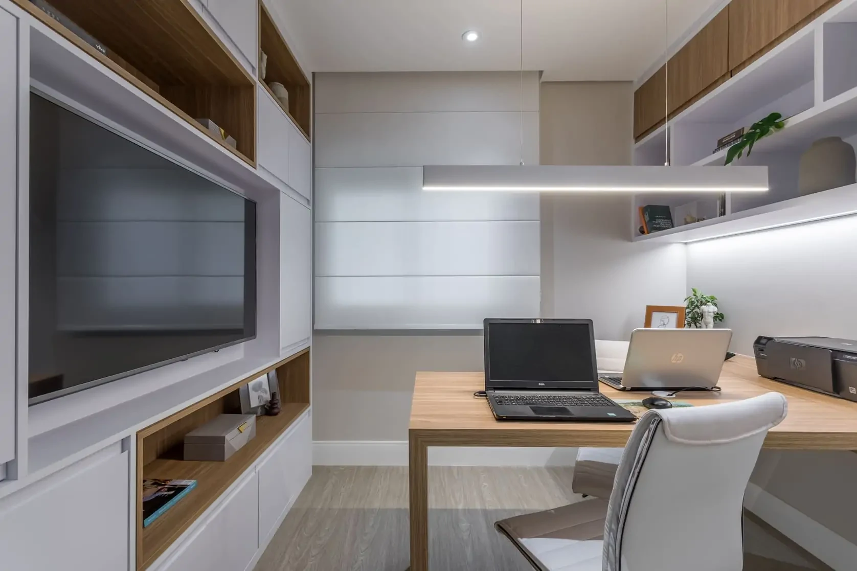 Também cuidamos de todos os detalhes do design da cozinha e do escritório, sempre pensando em praticidade, já que são os locais onde os dois trabalham.