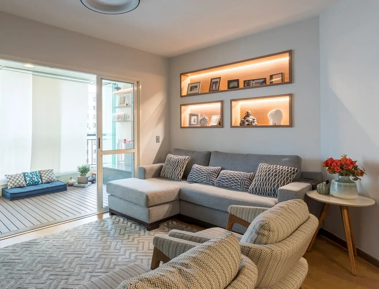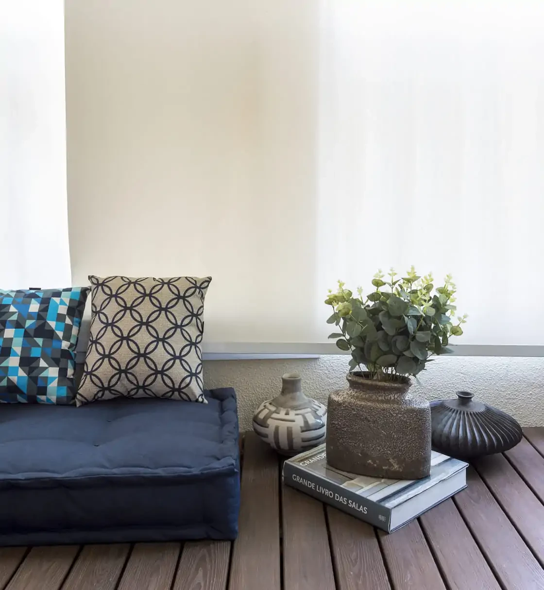 Na decoração da varanda projetamos um espaço para o filho aproveitar: lá ele pode agora armazenar os brinquedos e também é um espaço para leitura.