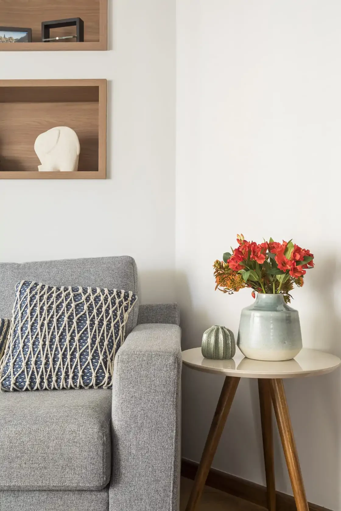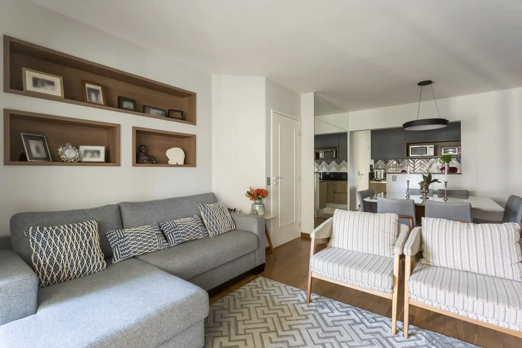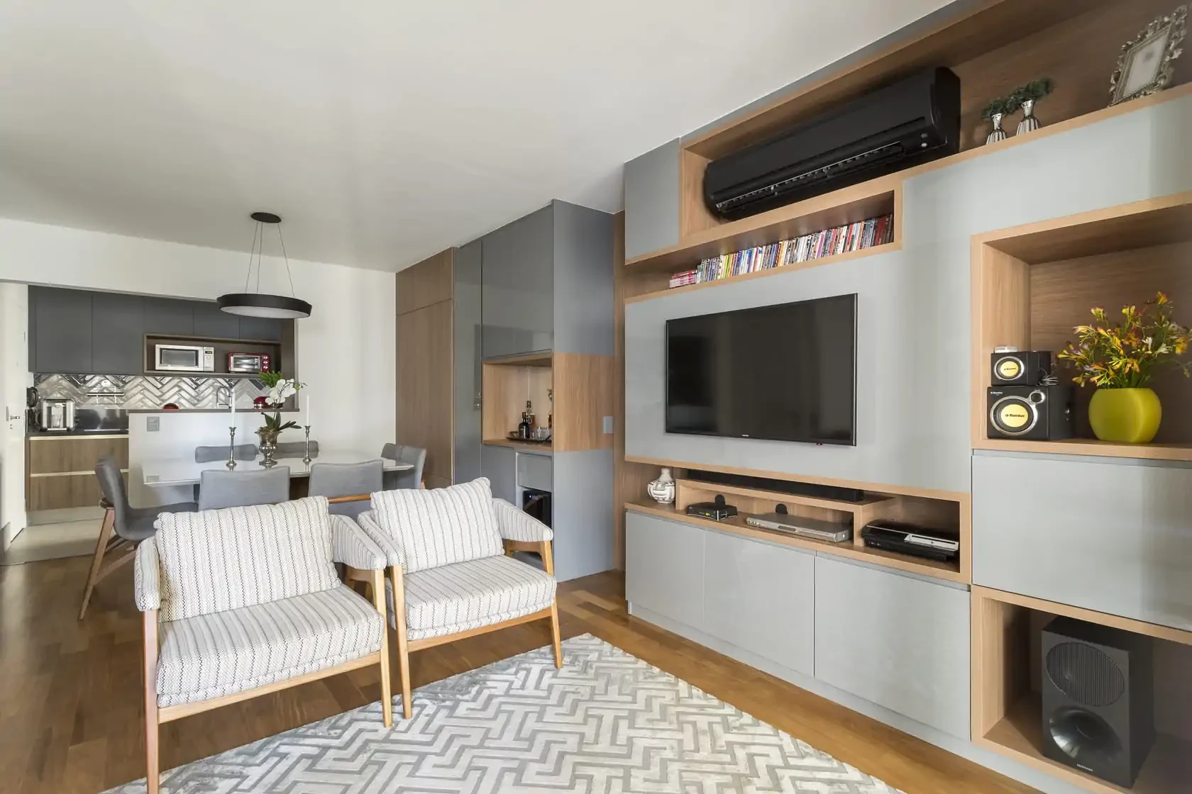 Procuramos manter os espaços integrados usando uma paleta única de cores. Também criamos novos armários, aproveitando melhor as paredes, e deixamos o centro da sala mais livre para circulação.