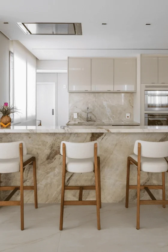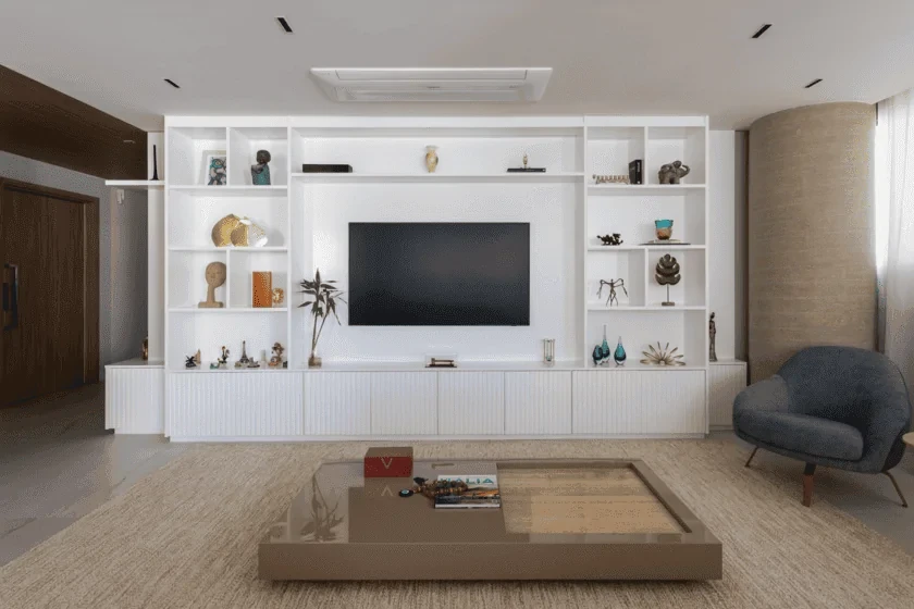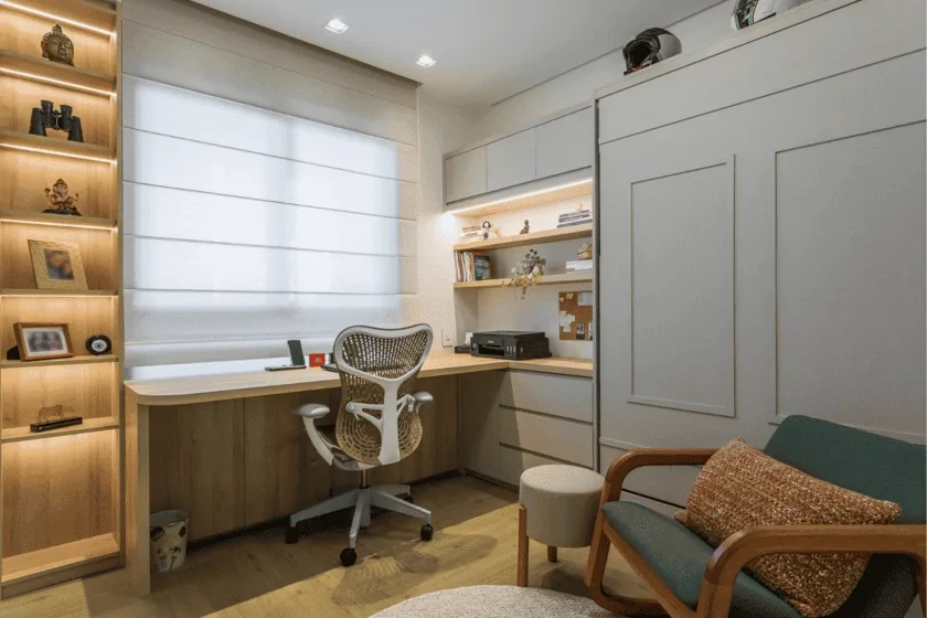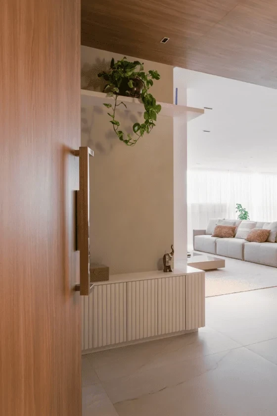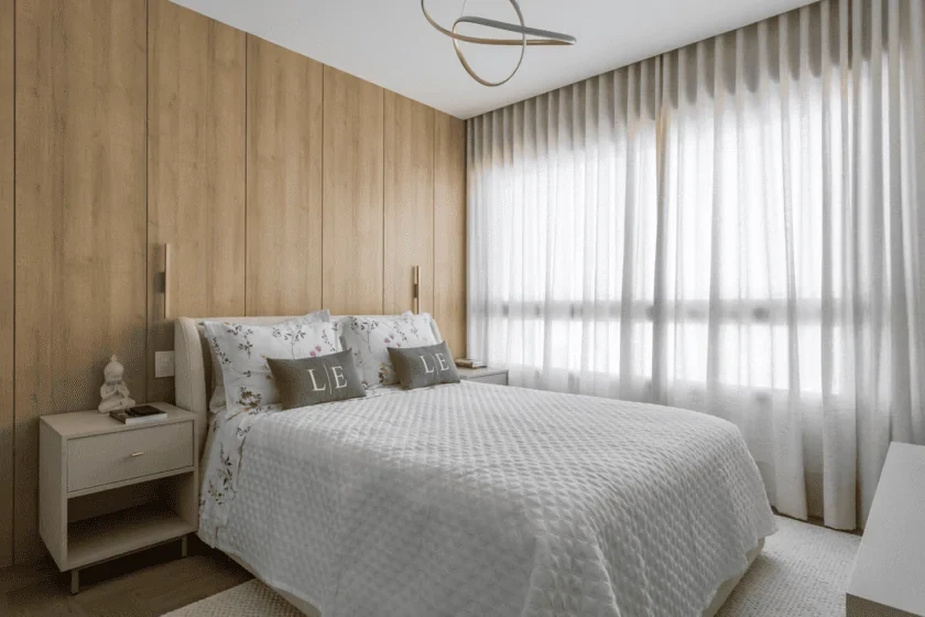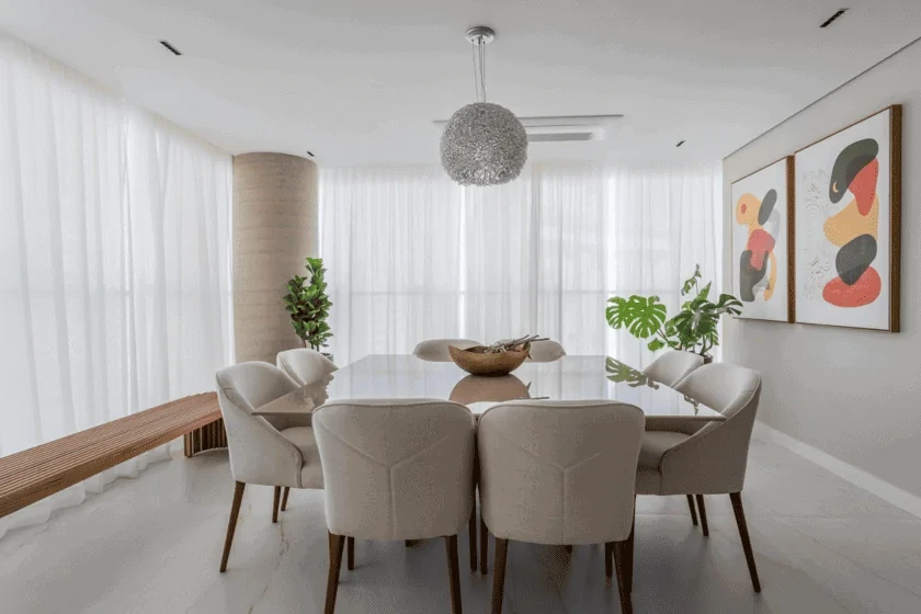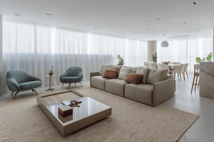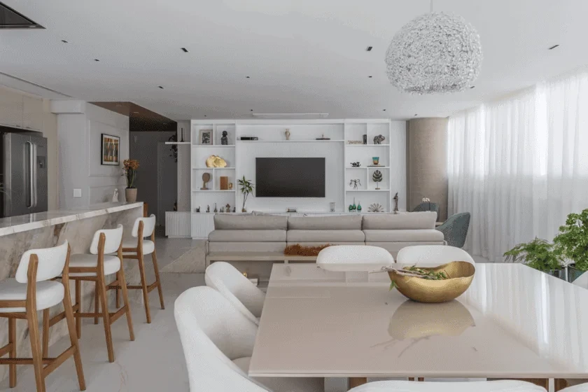 Desde o início, o projeto de design de interiores foi guiado pelo desejo de criar espaços integrados e claros, que pudessem valorizar a generosa iluminação natural do imóvel. A integração dos ambientes foi planejada para promover uma sensação de amplitude e fluidez, ao mesmo tempo em que cada detalhe foi pensado para reflexão, sofisticação e funcionalidade